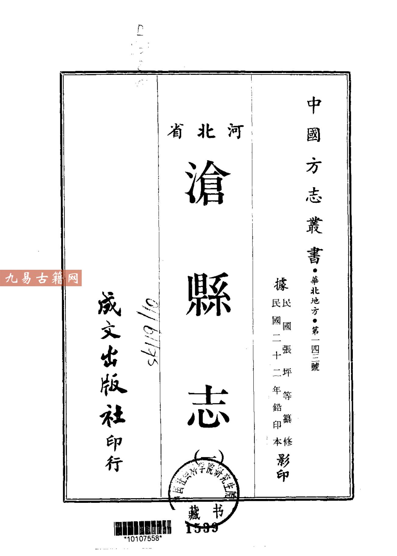 《沧县志》是记述河北省沧县地区历史、地理、社会变迁的地方志。现存通行本为1933年(民国二十二年)铅印刊行,由沧县县长张坪监修,本地学者袁之升、张儒玉等人总纂。