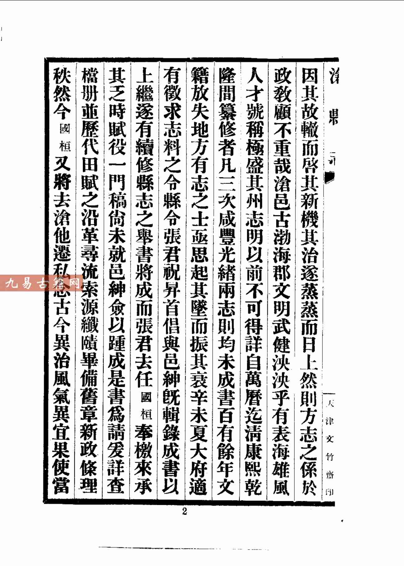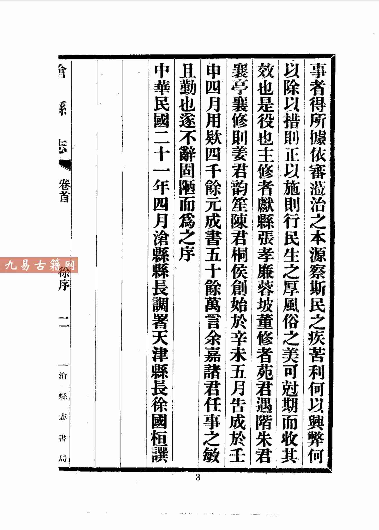 该志体例严谨,资料多采自清代旧志、官府档案及实地调查,既承续传统方志体系,亦纳入近代科学记录方法,对运河治理、军事防御等内容记述尤细。其编纂处于传统社会向近代转型时期,保留了清末民初沧县社会变迁的珍贵史料,具有重要的地方史与文献价值。