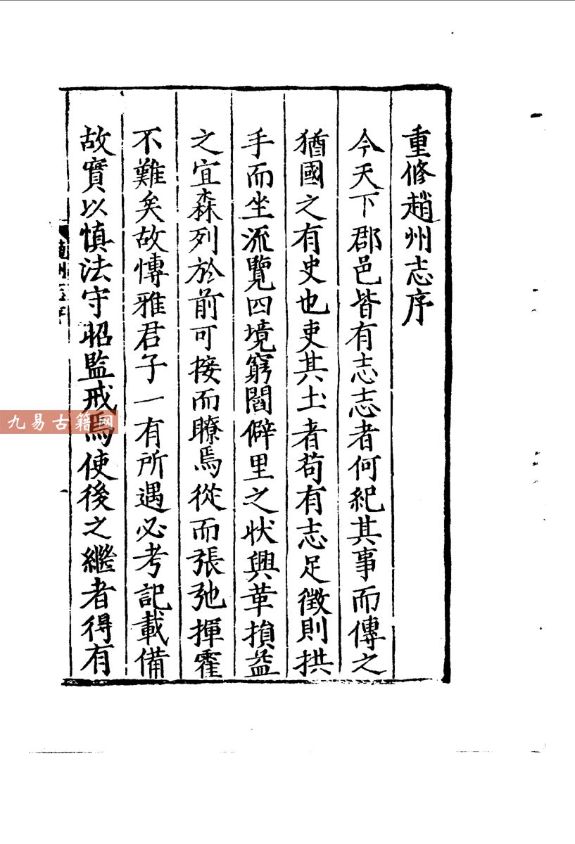 该志系统记述了赵州的历史沿革、地理疆域、山川形胜、户口田赋、官署建置、学校选举、人物传记、风俗物产及诗文著述等内容。其体例严谨,分地理、建置、祠祀、田赋、官师、人物、杂考七门,下设细目。志中尤其注重地方治理相关内容的记载,如赋役制度、水利设施、官学教育等,反映了明代中后期北方州县的社会实态。同时收录大量金石碑刻与文献辑录,保存了唐代《治平寺碑》等重要史料。