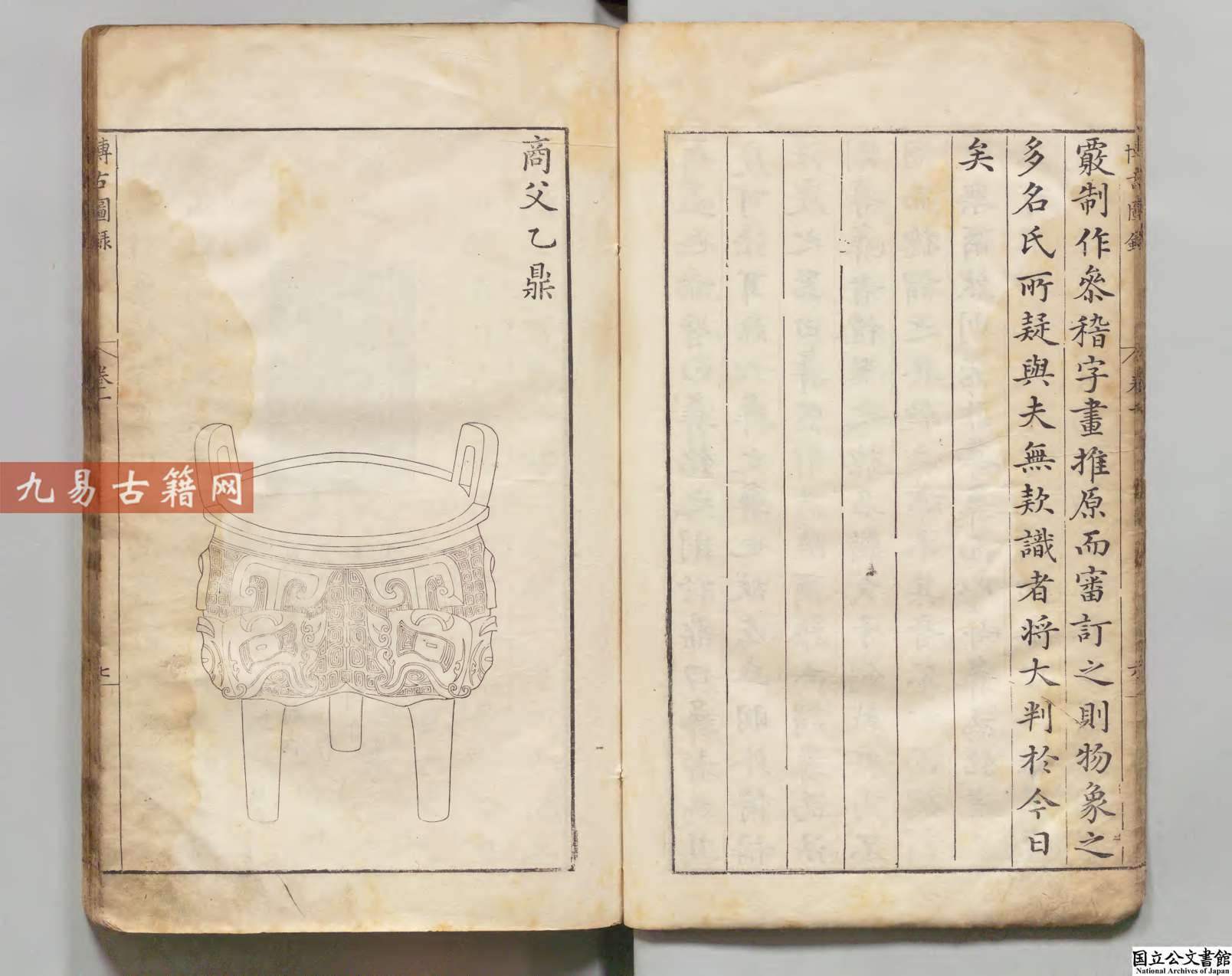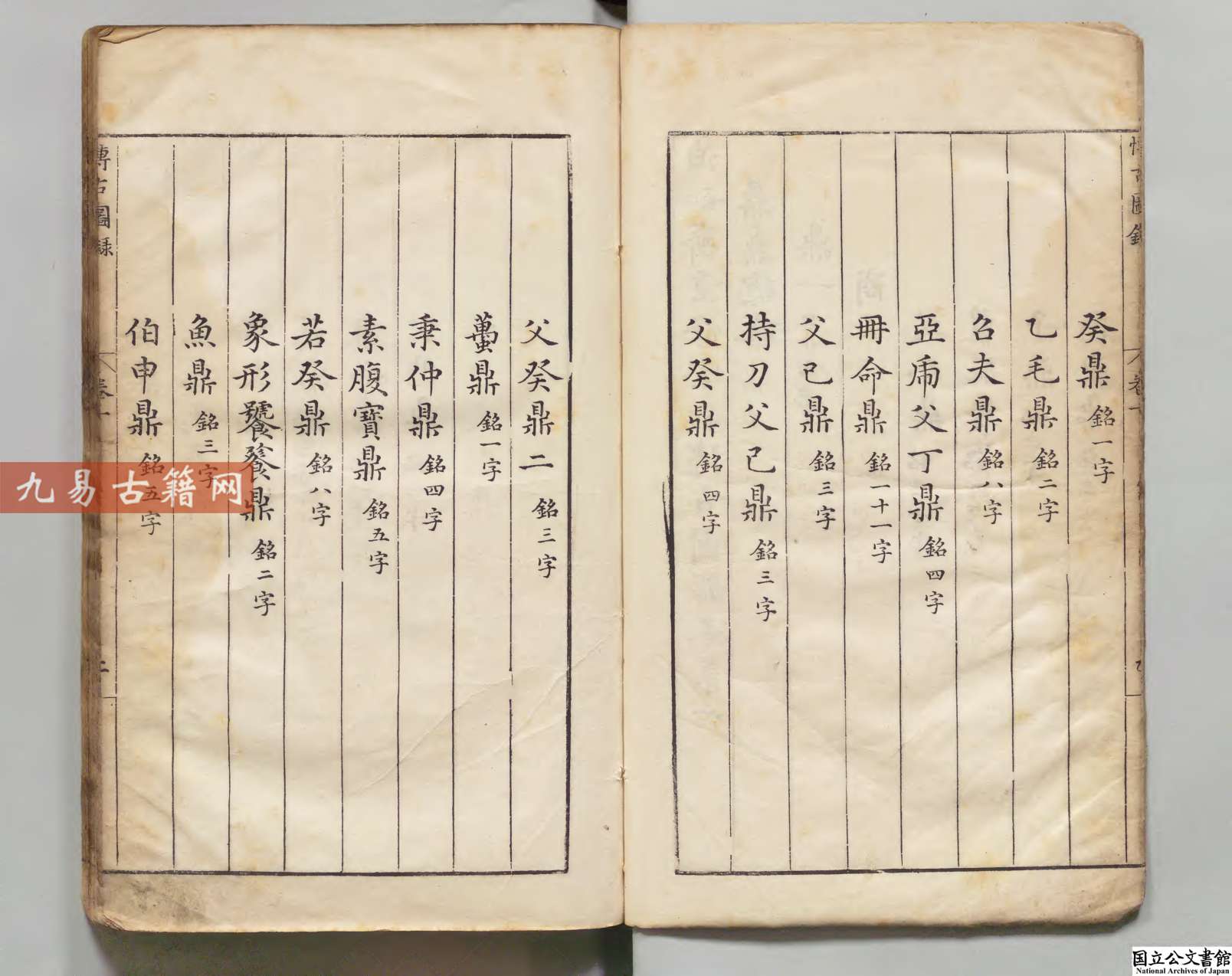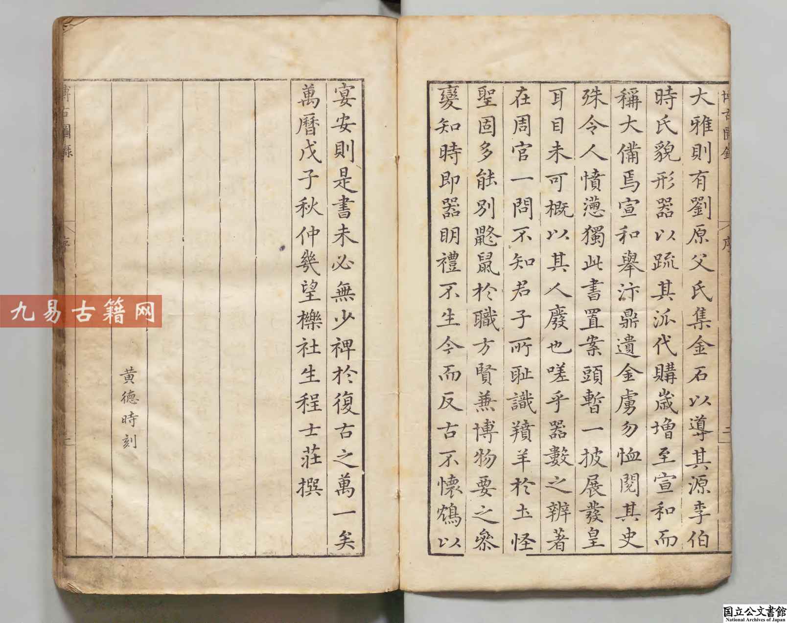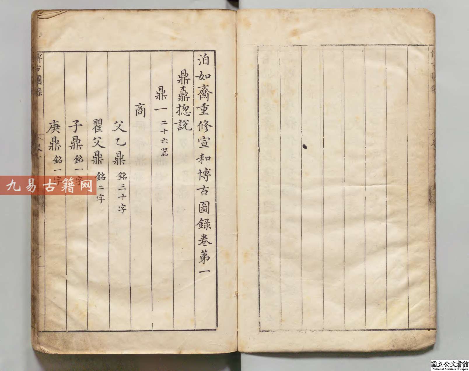 《泊如斎重修宣和博古圖録》是明代万历十六年(1588年)泊如斋书坊刊行的重修本,其底本为宋代王黼主持编纂的《宣和博古图》。该书由明代学者程子荘校订,属于金石学著作。内容系统收录了宋代皇室所藏商周至唐代的青铜器,共计八百余件,每器绘制图像,记述尺寸、重量、铭文及考释,并按器类编次。该书体现了宋明两代的金石学研究水平,兼具古器物图录与考释性质,对后世金石学、考古学影响深远。此万历刊本作为明代重要翻刻本,以校勘精审、摹刻细致著称,是研究中国青铜器与版本流传的重要文献。