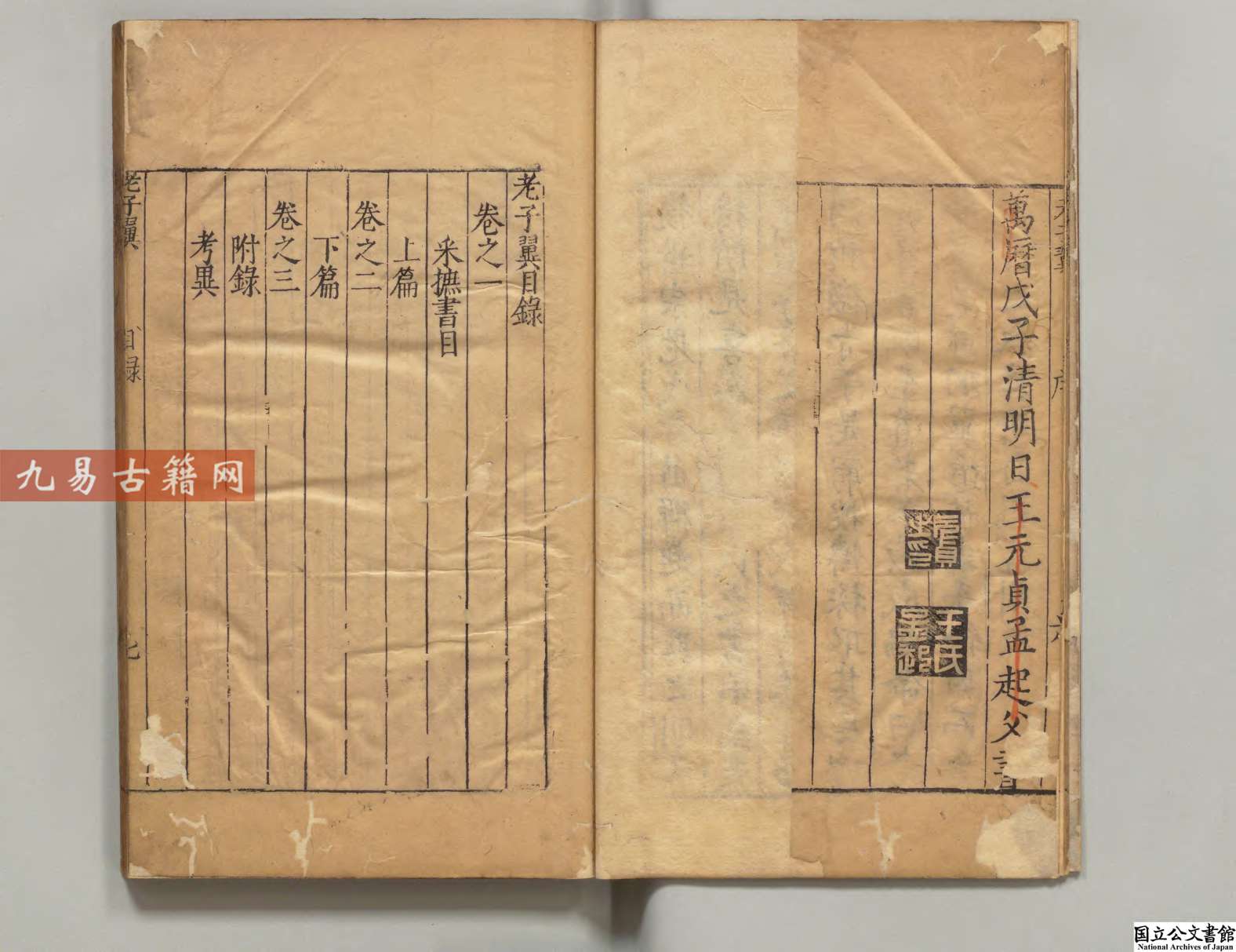 《老子翼》成书于明万历十六年(1588年),由焦竑编纂、王元贞校订刊行。该书属子部道家类文献,是一部汇集历代《老子》注疏的集释性著作。内容上以采录汉唐至明代诸家解老之说为主,尤重宋代苏辙、吕惠卿等理学背景注解,并附以焦竑按语阐发义理。其特征体现为晚明老学研究的集成性:采用“以老解老”的阐释路径,强调回归文本本义;编排体例上分层呈现经文、集注与编者评析,显现学术系统性;版本选用精审,校订严谨,反映万历时期考据学与心学交融的学术风气。此书既是对传统老学的总结,亦承载了晚明三教合一思潮下对道家思想的创造性诠释。├──老子翼 選者焦竑(明)/校訂者王元貞(明)明万暦16年刊本 57.7MB