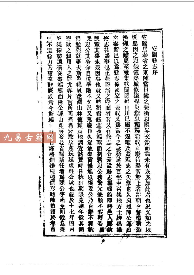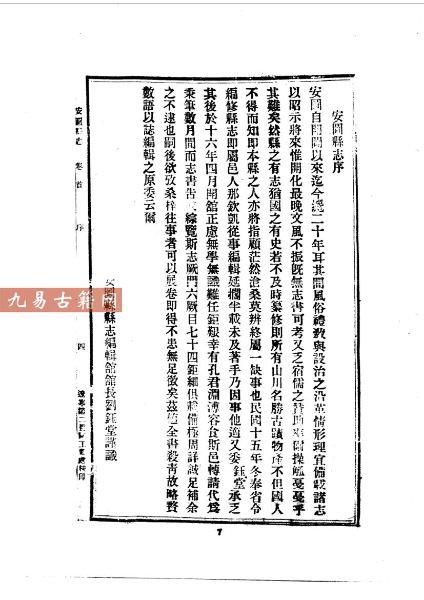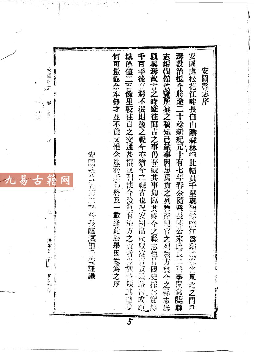 《民国安图县志》成书于1931年(民国二十年),由时任安图县知事陈鸿谟监修,刘钰堂等纂修。该书为铅印本,是民国时期吉林省安图县唯一一部系统性的地方志文献。