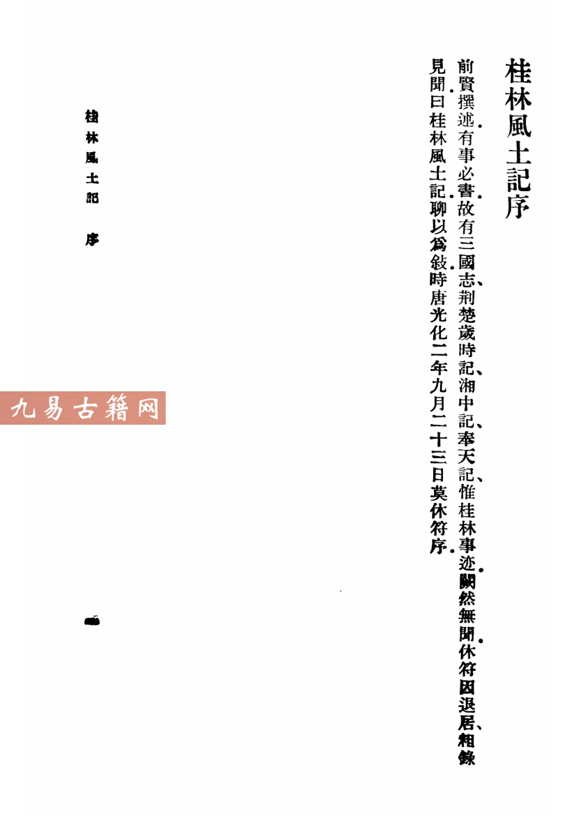 《桂林风土记》为唐代莫休符所著,成书于光化二年(公元899年),属地理风土志。内容专记桂林地区山川名胜、物产民俗及历史掌故,特征为翔实简洁,保存了唐代桂林自然与人文景观的珍贵资料,原书已佚,现存辑佚本。