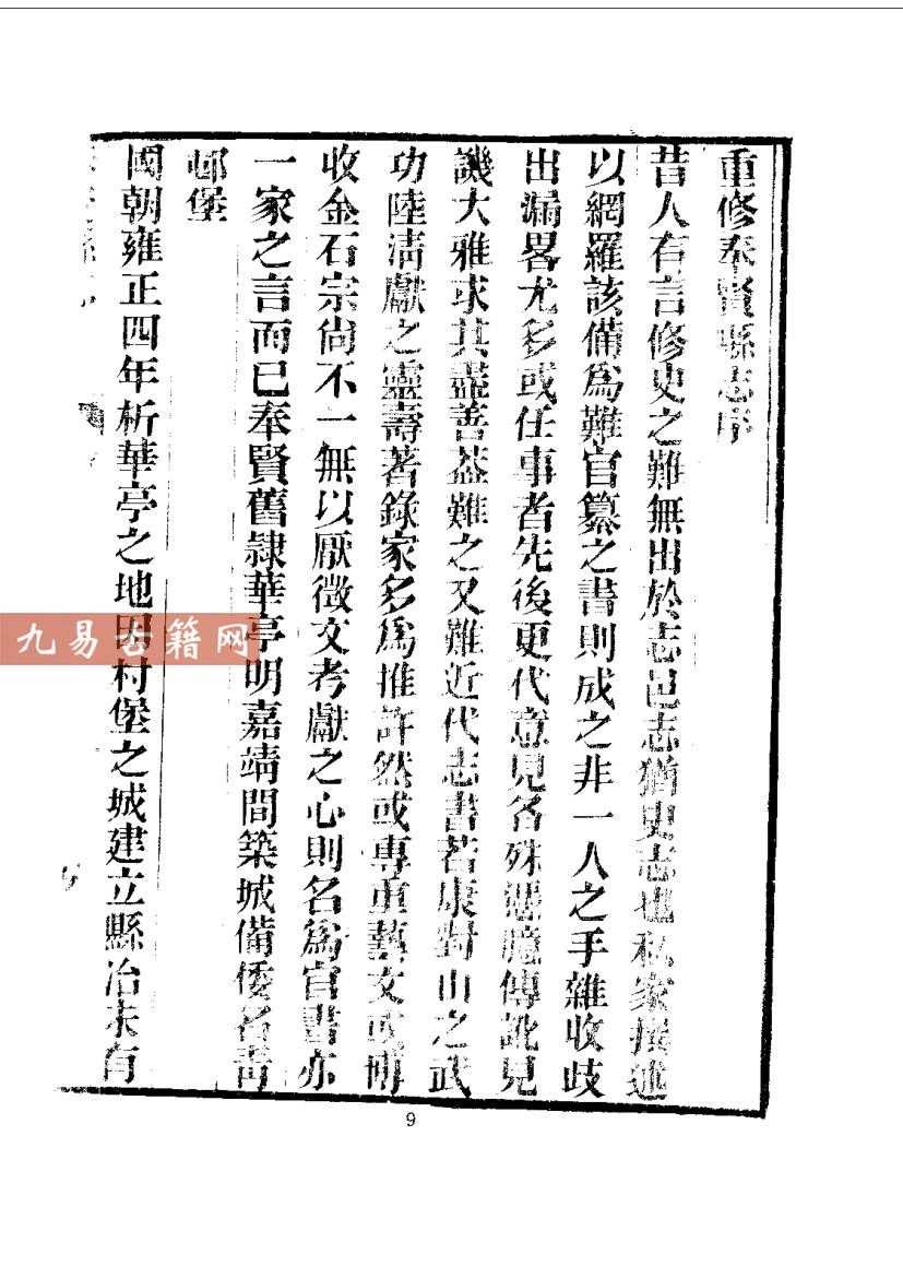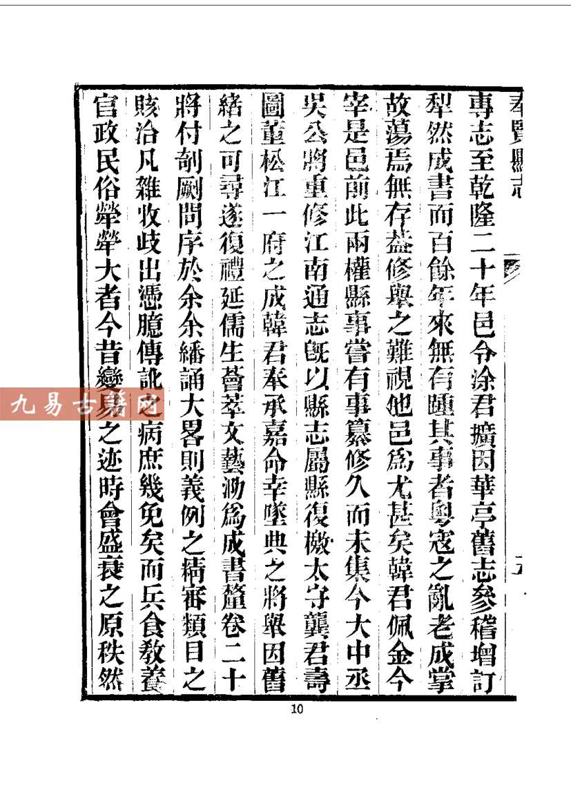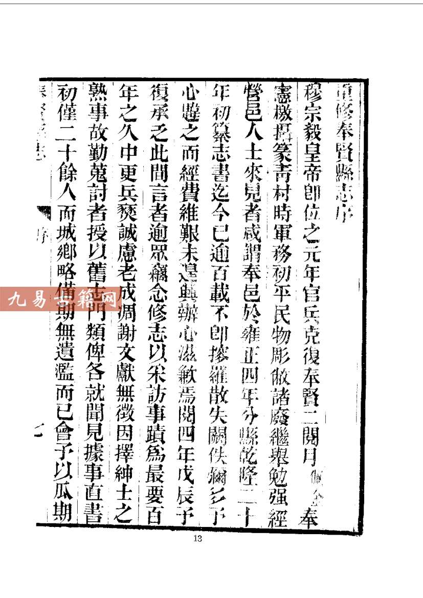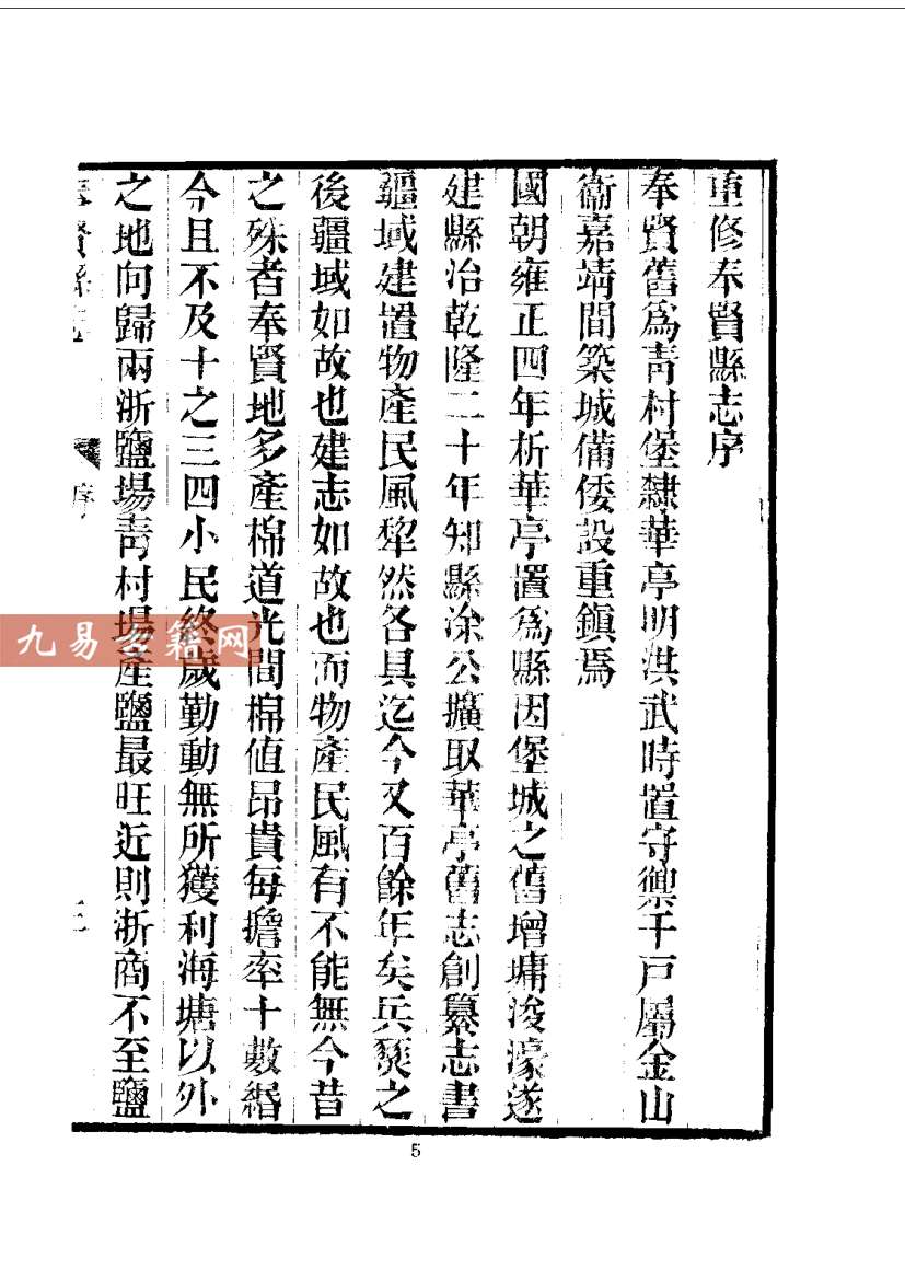《奉贤县志》是上海奉贤地区的官方地方志,现存最早版本为清乾隆年间奉贤知县刘修璁主修、本县学者戴兆祚等人编纂的《奉贤县志》,成书于乾隆二十三年(1758年)。该书属官修综合性方志,体例完备,特征鲜明:内容上涵盖舆地、建置、赋役、学校、职官、选举、人物、艺文等门类,尤重海塘水利、盐政民风等地方实况;类型上属于典型的清代县级地方志,系统记录了奉贤建县(1726年)后的自然、政治、经济与社会史料,具有较高的地域历史研究价值。全书资料翔实,编纂严谨,集中体现了清代江南县志的编修传统与地方治理文献特征。