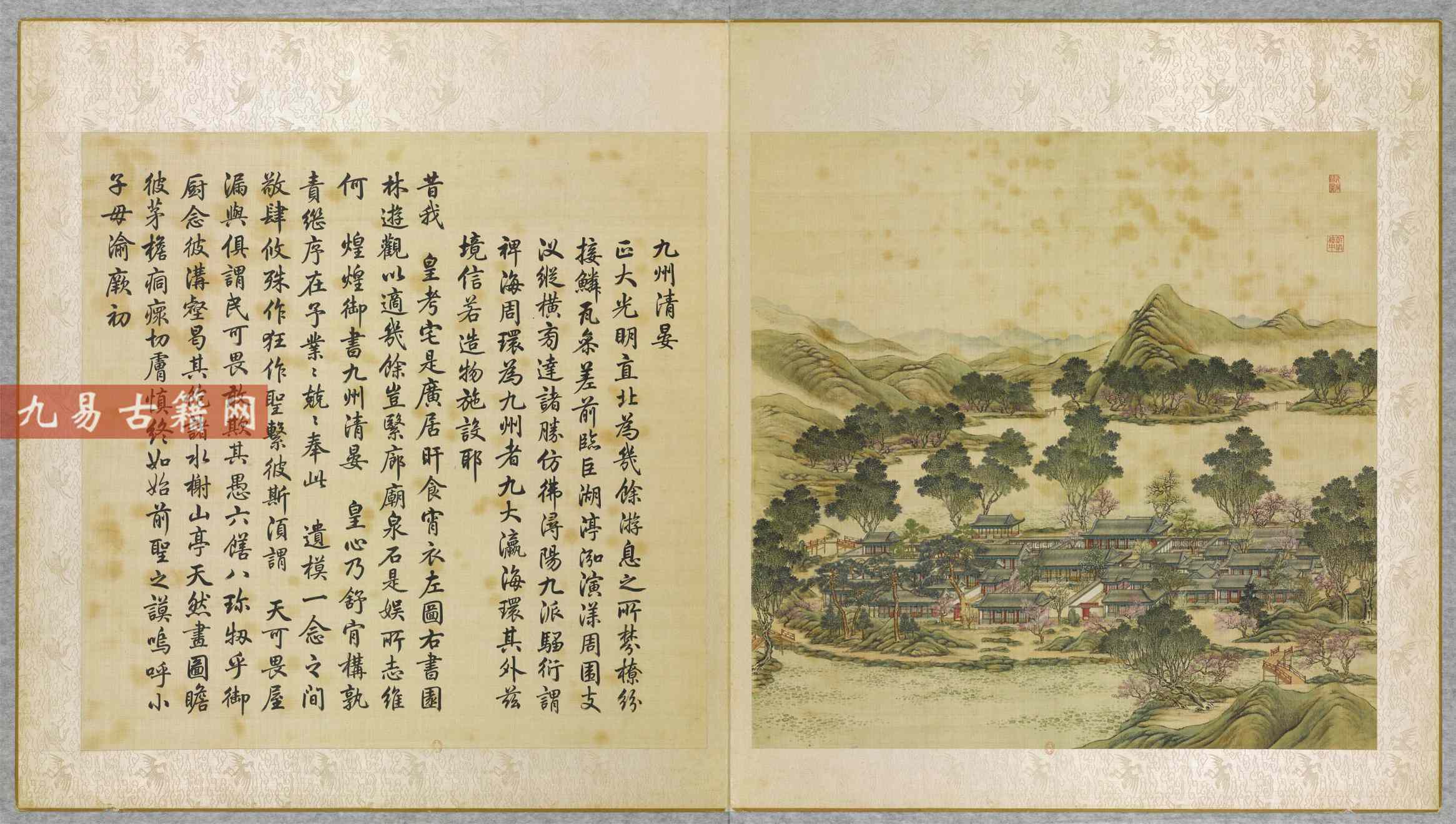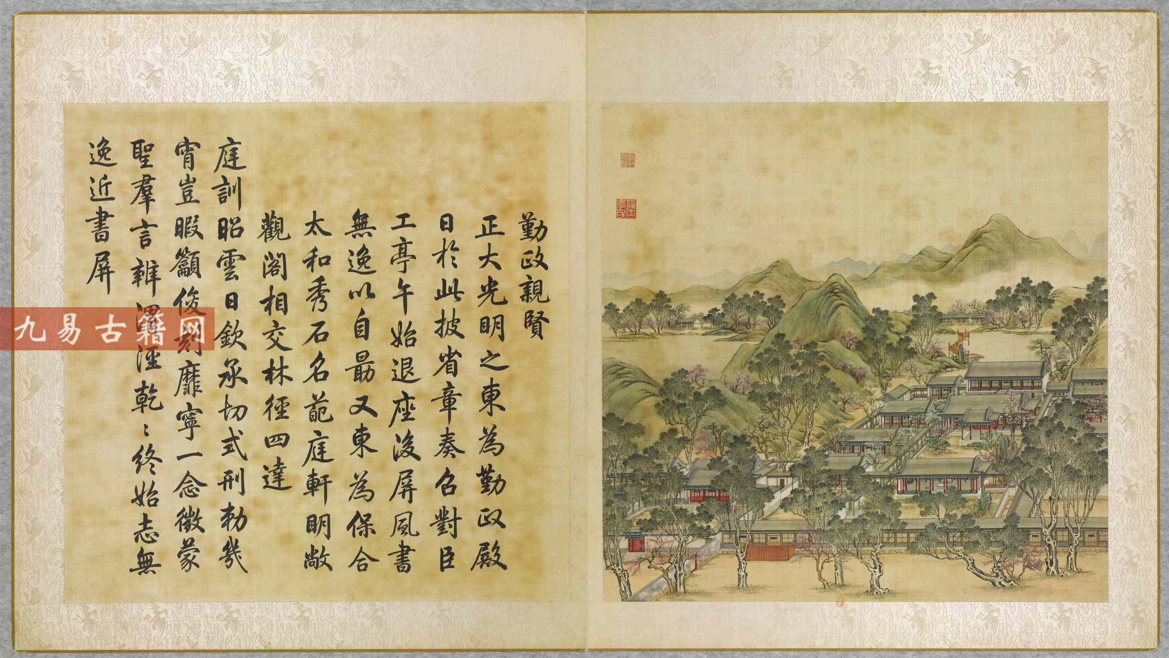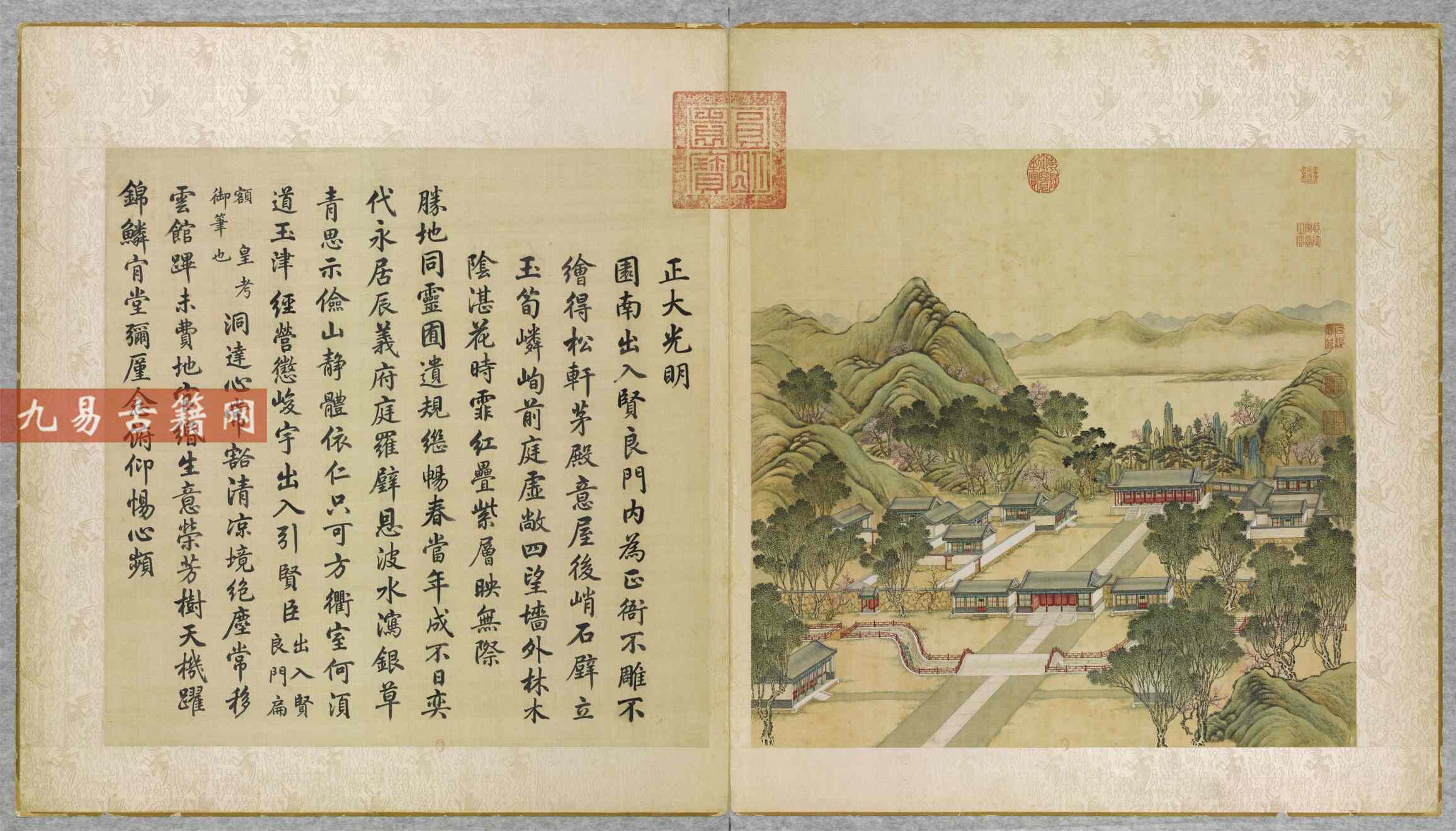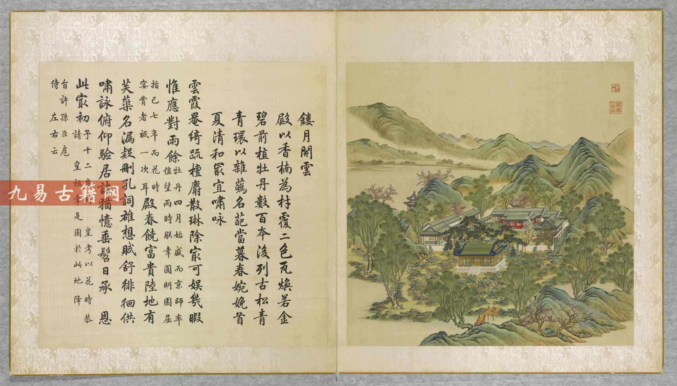 该画册成书于清乾隆九年(1744年),是奉乾隆皇帝之命,由宫廷画师唐岱、沈源等耗时多年绘制完成的工笔彩绘杰作 。每幅景图配以汪由敦书写的乾隆御制诗,诗、书、画高度统一,堪称清代宫廷艺术的巅峰之作。