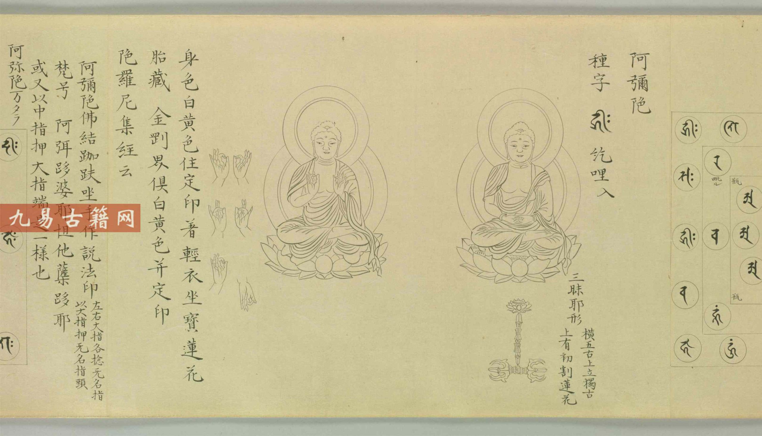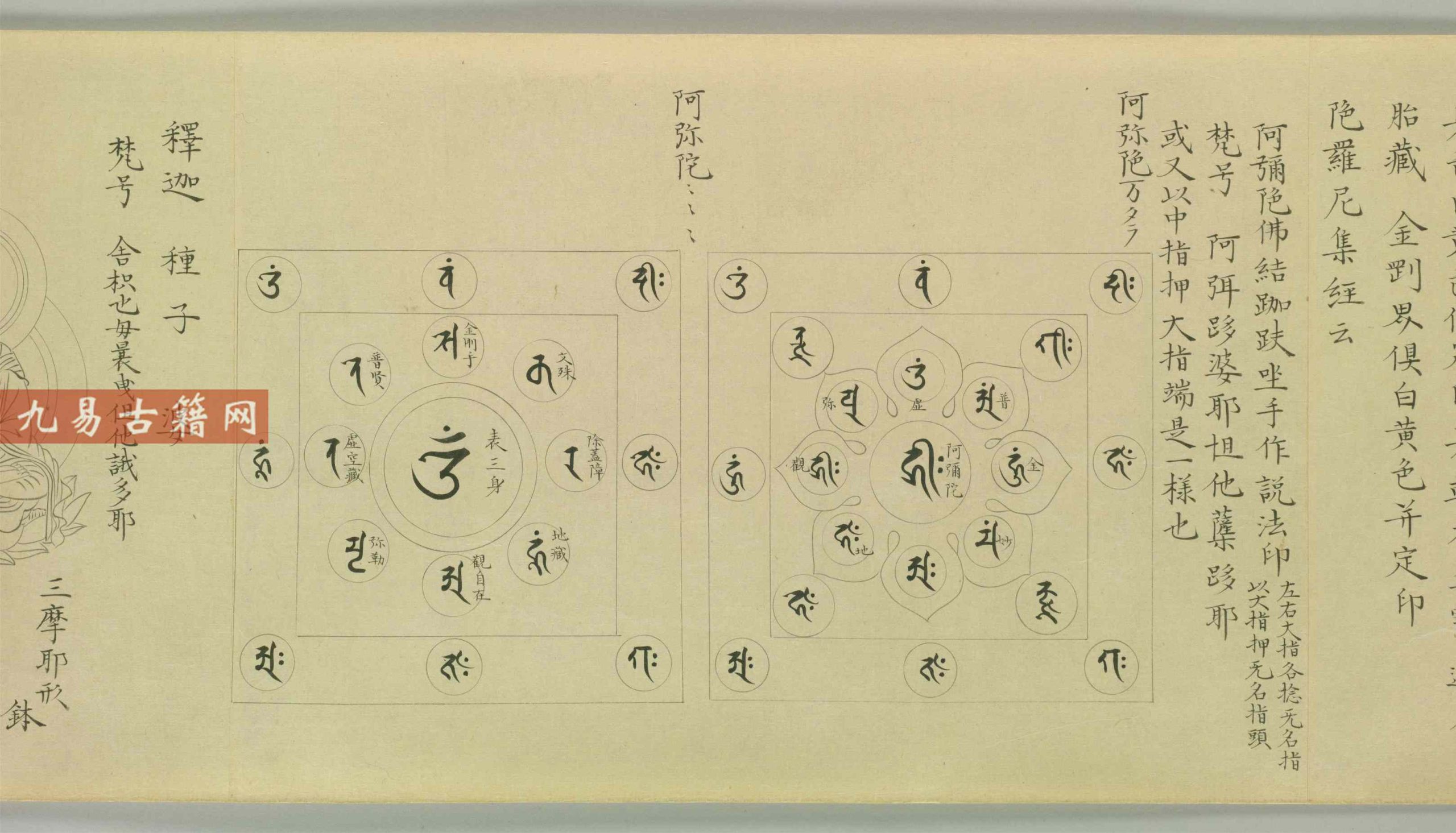 这本书像一本“密宗诸神实用手册”,图文并茂是最大特点:文字部分列尽诸尊的梵号、密号(类似“神的外号”)、种子字(神秘符号)、三形(象征物,如莲花、金刚杵)、道场观(修行时要想象的神圣场景)、印契(手印)和真言(咒语);插画部分则绘有诸尊的具体形象、曼荼罗(神圣图案),甚至标注了密供(供奉仪式)的步骤。