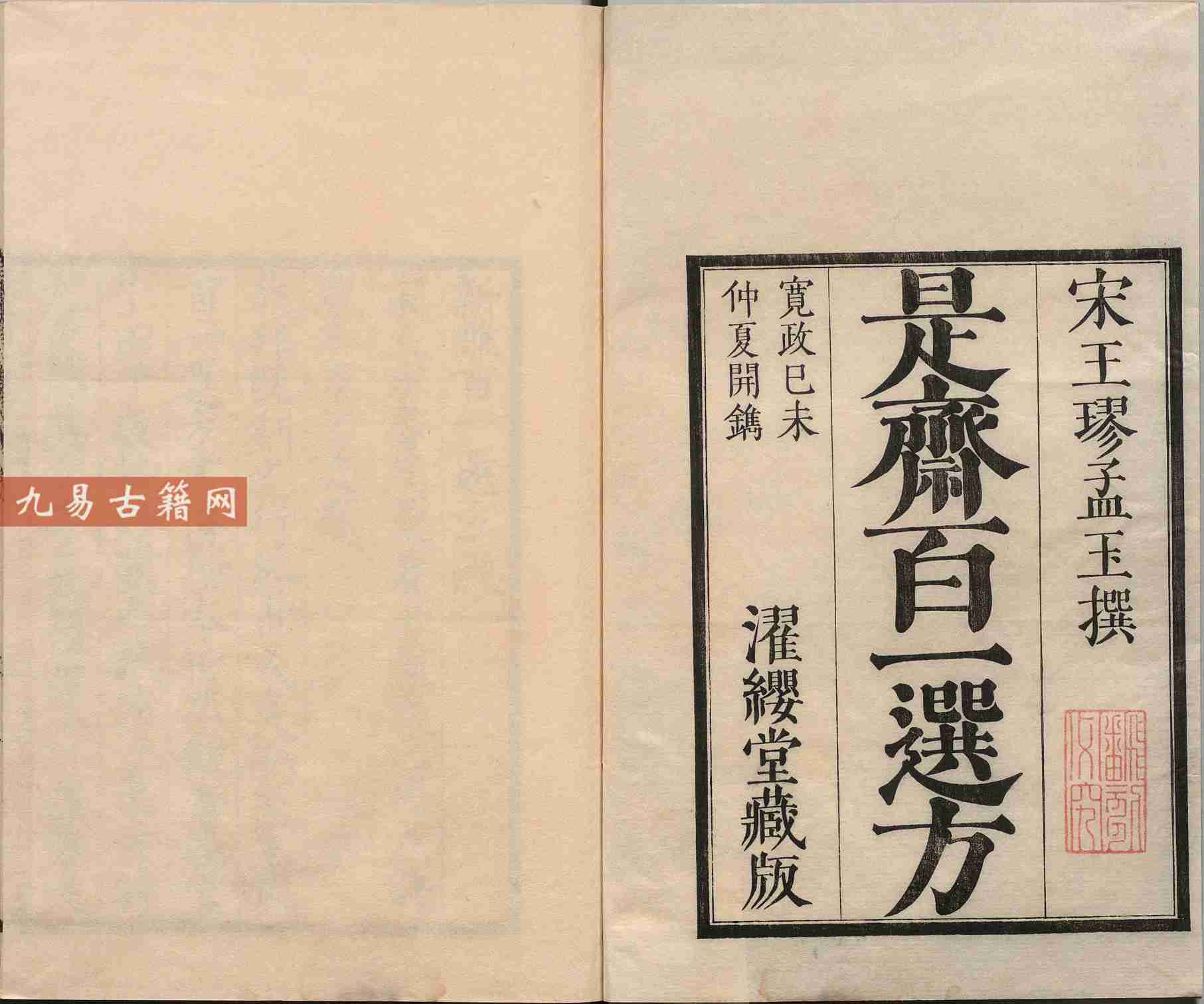 新刊续添是斋百一选方.二十卷.宋.王璆著.渥缨堂覆元建安刘氏刊本.pdf 371页。古籍整理双开电子版。